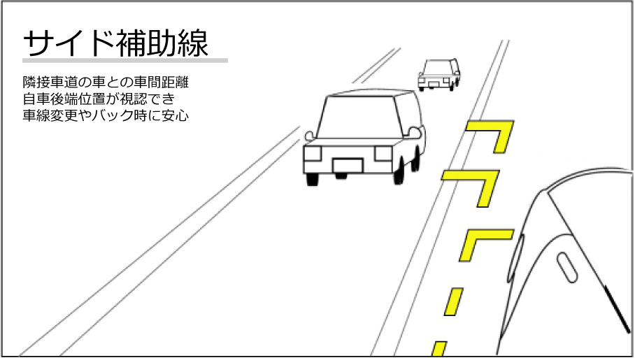 「サイド補助線」 は、車両のサイド側の後方を確認するためのモニターに表示され、隣接車両や障害物との距離感を測りやすくするための目安線を指します。サイド補助線は、車両の側面の状況に合わせて左右や上下、傾きの調整が可能で、運転者に右左折、車線変更、バックなどでの安全確認をサポートします。
