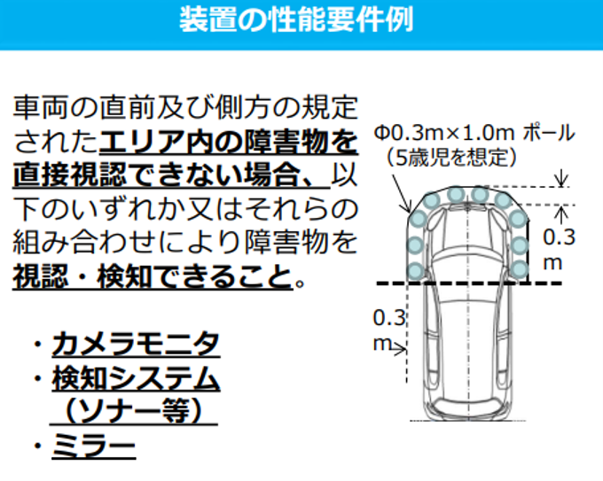 (1)乗用車等には、運転者席から死角となる車両の直前および側面にいる子どもなどの歩行者を確認できるように、鏡やカメラモニタ等の視認装置(既存国内基準適合装置でも可)またはソナー等の検知装置を備えなければならないこととします。